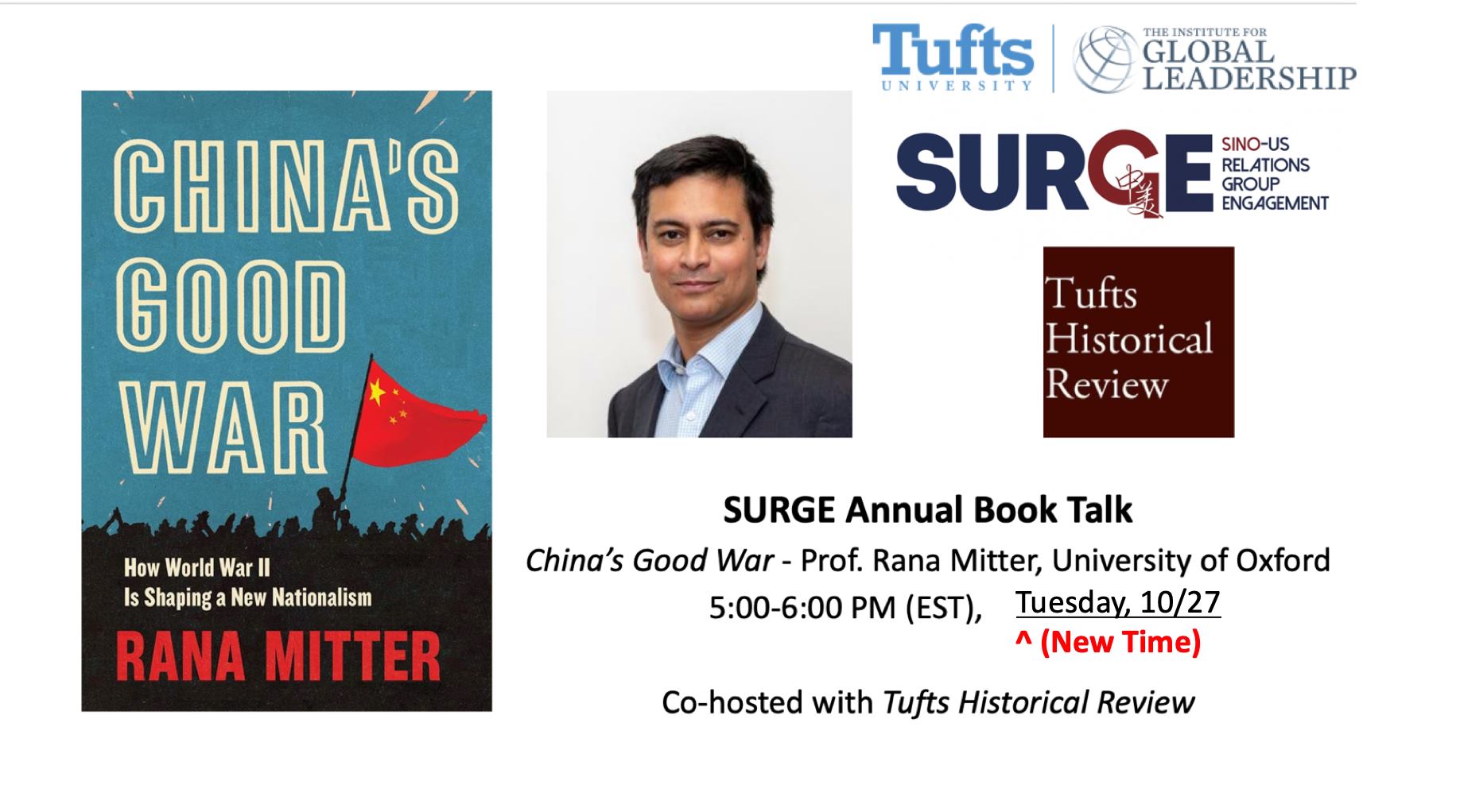 Since the turn of the century, China has grown increasingly more interested in redefining its post-World War II role to reshape both its domestic and international policy. On October 27th, Tufts SURGE had the honor of inviting Rana Mitter, a University of Oxford professor, for a discussion about his new book, China’s Good War, at our annual Book Talk. According to Professor Mitter, even though almost 100 million Chinese citizens became refugees in their own country and an estimated 15-20 million Chinese were killed either through combat or starvation during World War II, China’s participation in the war is not very well known around the world.